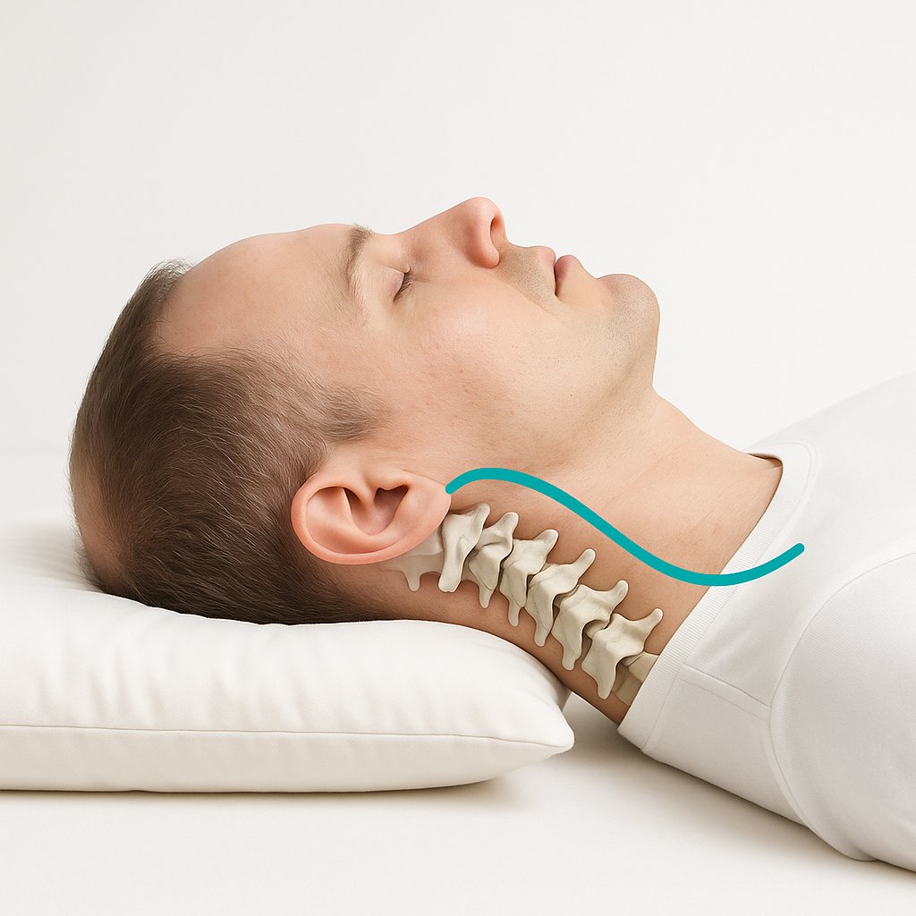Ein falsches Einsinken im Schulterbereich bringt den Nacken aus seiner neutralen Ausrichtung. Dadurch entstehen Verspannungen, Blockaden und häufiges „steifes Aufwachen“.